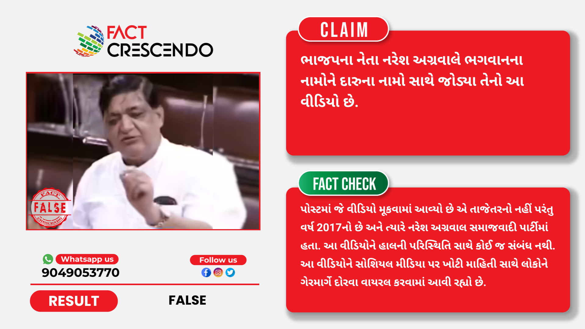 તાજેતરમાં સોશિયલ મીડિયા પર ભાજપના નેતા નરેશ અગ્રવાલનો એક વીડિયો વાયરલ થઈ રહ્યો છે. આ વીડિયો સાથેના લખાણમાં એવો દાવો કરવામાં આવી રહ્યો છે કે, ભાજપના નેતા નરેશ અગ્રવાલે ભગવાનના નામોને દારુના નામો સાથે જોડ્યા તેનો આ વીડિયો છે. પરંતુ ફેક્ટ ક્રેસેન્ડોની પડતાલમાં આ દાવો ખોટો હોવાનું સાબિત થાય છે કારણ કે, પોસ્ટમાં જે વીડિયો મૂકવામાં આવ્યો છે એ તાજેતરનો નહીં પરંતુ વર્ષ 2017નો છે અને ત્યારે નરેશ અગ્રવાલ સમાજવાદી પાર્ટીમાં હતા. આ વીડિયોને હાલની પરિસ્થિતિ સાથે કોઈ જ સંબંધ નથી. આ વીડિયોને સોશિયલ મીડિયા પર ખોટી માહિતી સાથે લોકોને ગેરમાર્ગે દોરવા વાયરલ કરવામાં આવી રહ્યો છે.