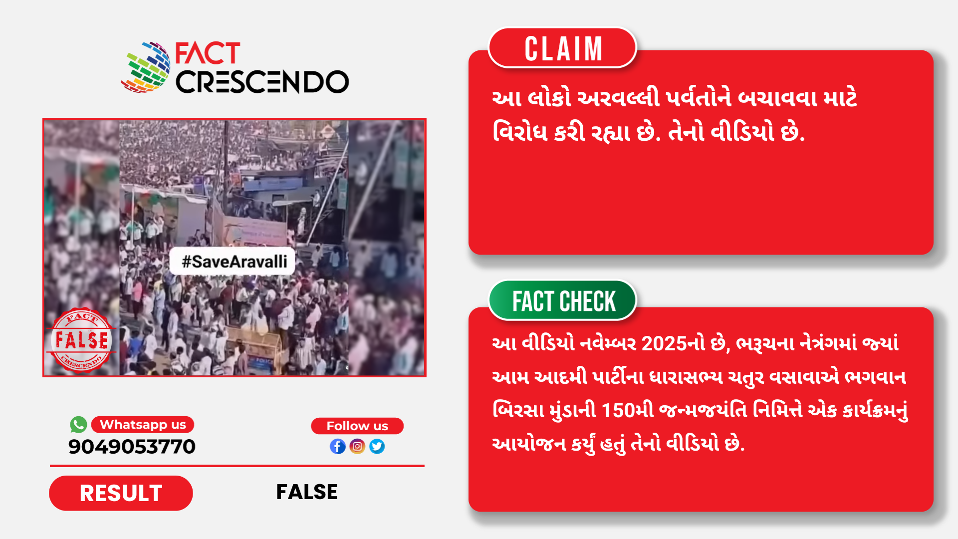 આમ, અમારી પડતાલમાં ઉપરોક્ત પોસ્ટ ખોટી સાબિત થાય છે. કારણ કે, આ વીડિયો નવેમ્બર 2025નો છે, ભરૂચના નેત્રંગમાં જ્યાં આમ આદમી પાર્ટીના ધારાસભ્ય ચતુર વસાવાએ ભગવાન બિરસા મુંડાની 150મી જન્મજયંતિ નિમિત્તે એક કાર્યક્રમનું આયોજન કર્યું હતું તેનો વીડિયો છે.