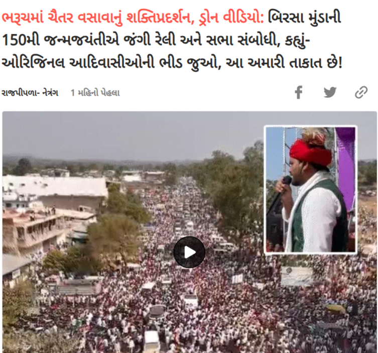 તેમજ વધુ સર્ચ કરતા અમને દિવ્યભાસ્કર દ્વારા પ્રસારિત અહેવાલ પ્રાપ્ત થયો હતો. જેની સાતે માહિતી આપવામાં આવી હતી કે, “ભરૂચ જિલ્લાના નેત્રંગમાં ક્રાંતિકારી બિરસા મુંડાજીની 150મી જન્મજયંતિ ખૂબ જ ધામધૂમથી ઉજવવામાં આવી હતી. આ કાર્યક્રમમાં ડેડિયાપાડાના આમ આદમી પાર્ટી AAPના ધારાસભ્ય ચૈતર વસાવા મુખ્ય મહેમાન તરીકે હાજર રહ્યા હતા. સમારોહ પછી, ધારાસભ્ય વસાવાએ એક વિશાળ જાહેર સભાને સંબોધિત કરી હતી.”