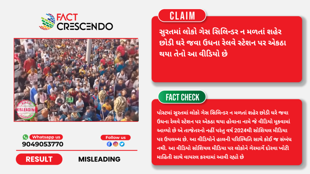 તાજેતરમાં સોશિયલ મીડિયા પર રેલવે સ્ટેશન પર ઉમટેલી લોકોની ભીડનો એક વીડિયો વાયરલ થઈ રહ્યો છે જેની સાથે એવો દાવો કરવામાં આવી રહ્યો છે કે, સુરતમાં લોકો ગેસ સિલિન્ડર ન મળતાં શહેર છોડી ઘરે જવા ઉધના રેલવે સ્ટેશન પર એકઠા થયા તેનો આ વીડિયો છે પરંતુ ફેક્ટ ક્રેસેન્ડોની પડતાલમાં આ દાવો ભ્રામક હોવાનું સાબિત થાય છે કારણ કે, પોસ્ટમાં સુરતમાં લોકો ગેસ સિલિન્ડર ન મળતાં શહેર છોડી ઘરે જવા ઉધના રેલવે સ્ટેશન પર એકઠા થયા હોવાના નામે જે વીડિયો મૂકવામાં આવ્યો છે એ તાજેતરનો નહીં પરંતુ વર્ષ 2024થી સોશિયલ મીડિયા પર ઉપલબ્ધ છે. આ વીડિયોને હાલની પરિસ્થિતિ સાથે કોઈ જ સંબંધ નથી. આ વીડિયો સોશિયલ મીડિયા પર લોકોને ગેરમાર્ગે દોરવા ખોટી માહિતી સાથે વાયરલ કરવામાં આવી રહ્યો છે.