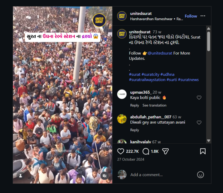 જેના કેપ્શનમાં એવી માહિતી આપવામાં આવી હતી કે, દિવાળી પર વતન જવા સુતના ઉધના રેલવે સ્ટેશન પર લોકો ઉમટી પડ્યા હતા તેની ભીડના આ દ્રશ્યો છે.