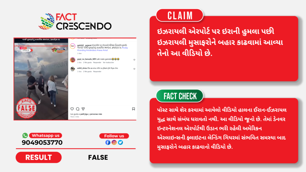 આમ, અમારી પડતાલમાં ઉપરોક્ત પોસ્ટ ખોટી સાબિત થાય છે. કારણ કે, પોસ્ટ સાથે શેર કરવામાં આવેલો વીડિયો હાલના ઈરાન-ઈઝરાયલ યુદ્ધ સાથે સંબંધ ધરાવતો નથી. આ વીડિયો જૂનો છે. તેમાં ડેનવર ઇન્ટરનેશનલ એરપોર્ટથી ઉડાન ભરી રહેલી અમેરિકન એરલાઇન્સની ફ્લાઇટના લેન્ડિંગ ગિયરમાં સંભવિત સમસ્યા બાદ મુસાફરોને બહાર કાઢવાનો વીડિયો છે.
