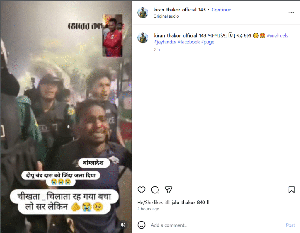 સોશિયલ મીડિયા યુઝર્સ દ્વારા તારીખ 25 ડિસેમ્બર 2025ના એક પોસ્ટ શેર કરવામાં આવી હતી. આ પોસ્ટમાં દાવો કરવામાં આવ્યો હતો કે, “આ વીડિયોમાં બાંગ્લાદેશ પોલીસ દ્વારા દીપુ ચંદ્ર દાસને ટોળાને સોંપવામાં આવ્યો તેનો છે.”