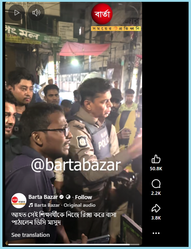 વાયરલ વીડિયોમાં બાંગ્લાદેશ પોલીસ દ્વારા દીપુ ચંદ્ર દાસને ટોળાને સોંપવામાં આવતો નથી. આ વીડિયો જૂનો છે. તેમાં ઢાકા કોલેજના ઘાયલ વિદ્યાર્થીને બતાવવામાં આવ્યો છે. ડેપ્યુટી કમિશનર મસુદ આલમે તેને રિક્ષામાં બેસાડવામાં મદદ કરી અને તેને હોસ્ટેલમાં પાછો મોકલ્યો.