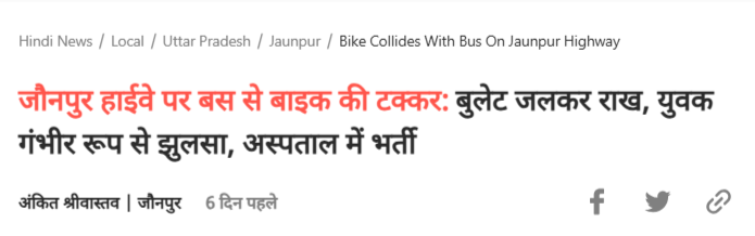 તેમજ વધુ સર્ચ કરતા અમને દૈનિક ભાસ્કર દ્વારા પણ આ અંગે વિસ્તૃત માહિતી આપતો અહેવાલ પ્રસારિત કર્યો હતો. જેની સાથે માહિતી આપવામાં આવી હતી કે, “સ્થાનિક રહેવાસીઓના જણાવ્યા અનુસાર, જૌનપુરથી સુલતાનપુર જતી રોડવેઝ બસે તે જ દિશામાં જઈ રહેલા બુલેટ બાઇક સવારને ઓવરટેક કરવાનો પ્રયાસ કર્યો હતો. ત્યારબાદ બસ ચાલકે બાઇકને ટક્કર મારી હતી. ટક્કર બાદ, બુલેટ બાઇક બસના પાછળના ટાયરમાં ફસાઈ ગઈ અને લગભગ બે મીટર સુધી ખેંચાઈ ગઈ.”