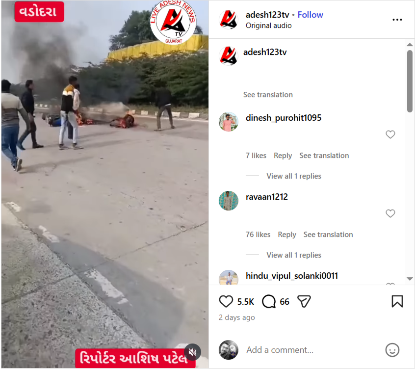 હાલ એક વીડિયો સોશિયલ મીડિયામાં વાયરલ થઈ રહ્યો છે. જેમાં હાઈ-વે પર એક બાઈકમાં ભયંકર આગ લાગી હોવાનું જોઈ શકાય છે. જ્યારે આ જ બાઈકની બાજુમાં એક યુવાન પણ સળગેલી હાલતમાં જોવા મળે છે આસાપાસના લોકો આ યુવાનને આગ માંથી બહાર કાઢવાના પ્રયત્ન કરી રહ્યા છે. આ વીડિયોને શેર કરીને દાવો કરવામાં આવી રહ્યો છે કે, “ગંભીર અકસ્માતના આ દ્રશ્યો ગુજરાતના વડોદરા શહેરના છે.”