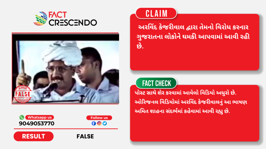 આમ, અમારી પડતાલમાં ઉપરોક્ત પોસ્ટ ખોટી સાબિત થાય છે. કારણ કે,પોસ્ટ સાથે શેર કરવામાં આવેલો વિડિયો અધુરો છે. અરવિંદ કેજરીવાલ દ્વારા આ ભાષણનો વિડિયો અમિત શાહના સંદર્ભમાં કહેવામાં આવી રહ્યો હતો. ગુજરાતની જનતાને કેજરીવાલ ધમકી આપતા હોવાની વાત તદ્દન ખોટી છે.