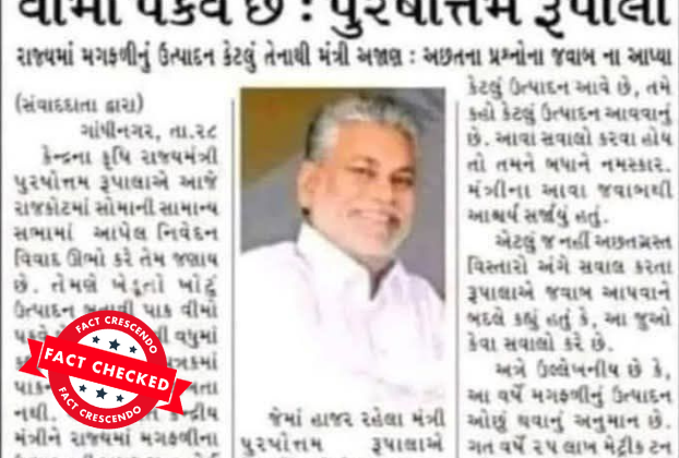 તાજેતરમાં સોશિયલ મીડિયા પર સમાચારપત્રના એક કટિંગમાં ભાજપના નેતા પુરષોત્તમ રુપાલાનું એક નિવેદન વાયરલ થઈ રહ્યું છે. જેમાં પોસ્ટમાં મૂકવામાં આવેલા ફોટો સાથેના લખાણમાં એવો દાવો કરવામાં આવી રહ્યો છે કે, તાજેતરમાં ભાજપના નેતા પુરષોત્તમ રુપાલાએ એવું કહ્યું કે, ખેડૂતો ખોટું ઉત્પાદન બતાવી પાક વીમો પકવે છે. પરંતુ ફેક્ટ ક્રેસેન્ડોની પડતાલમાં આ દાવો અધૂરી માહિતી સાથેનો હોવાનું સાબિત થાય છે કારણ કે, પોસ્ટ સાથે શેર કરવામાં આવેલું પુરષોત્તમ રૂપાલાનું નિવેદન હાલનું નહિં પરંતુ વર્ષ 2018નું છે. તેમના દ્વારા હાલમાં ખેડૂતોને લઈ આ પ્રકારે કોઈ નિવેદન આપવામાં આવ્યું નથી. સોશિયલ મીડિયા પર અધૂરી માહિતી મૂકીને લોકોને ગેરમાર્ગે દોરવામાં આવી રહ્યા છે.
