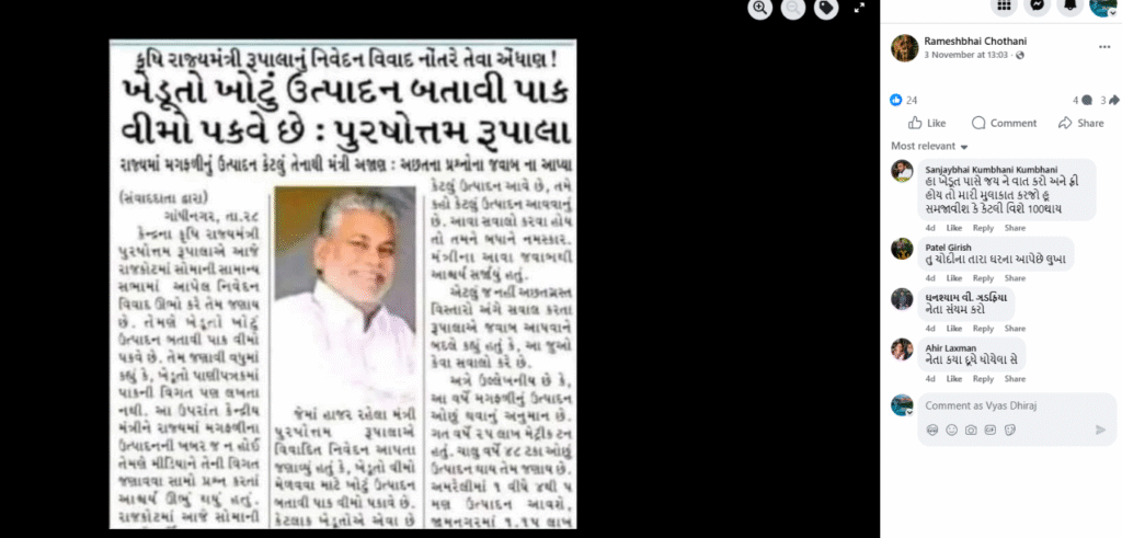 એક સોશિયલ મીડિયા યુઝર દ્વારા 3 નવેમ્બર, 2025ના રોજ એક પોસ્ટ શેર કરવામાં આવી હતી. પોસ્ટમાં મૂકવામાં આવેલા ફોટોના લખાણમાં એવો દાવો કરવામાં આવી રહ્યો છે કે, તાજેતરમાં ભાજપના નેતા પુરષોત્તમ રુપાલાએ એવું કહ્યું કે, ખેડૂતો ખોટું ઉત્પાદન બતાવી પાક વીમો પકવે છે.
