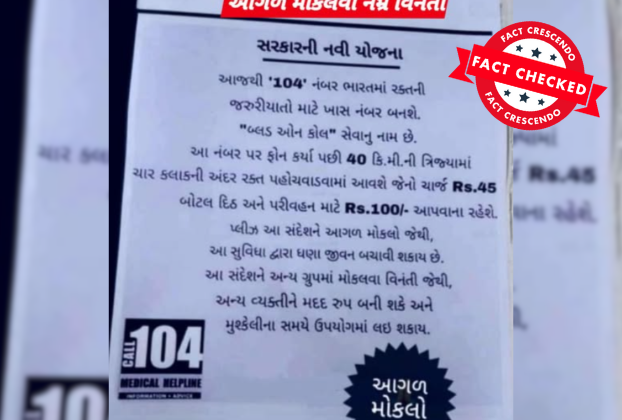 પોસ્ટ સાથે શેર કરવામાં આવેલી માહિતી તદ્દન ખોટી છે. 104 નંબર ફક્ત આરોગ્ય લક્ષી જાણકારી મેળવવા માટે છે. ‘બ્લડ ઓન કોલ’ નામની સેવા શરૂ કરવામાં આવી હોવાની વાત તદ્દન ખોટી છે. હાલમાં એક મેસેજ સોશિયલ મિડિયા પર ખૂબ જ વાયરલ થઈ રહ્યો છે. જે મેસેજમાં લખવામાં આવ્યુ છે કે, “આજથી’104’ નંબર ભારતમાં રક્તની જરૂરીયાતો માટે […]