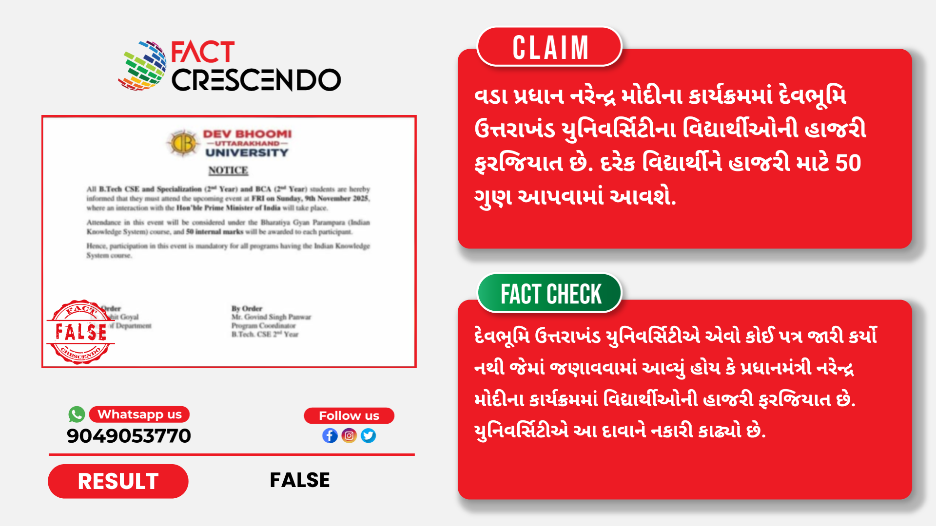 સોશિયલ મીડિયા યુઝર્સ દ્વારા તારીખ 09 નવેમ્બર 2025ના એક પોસ્ટ શેર કરવામાં આવી હતી. આ પોસ્ટમાં દાવો કરવામાં આવ્યો હતો કે, “વડા પ્રધાન નરેન્દ્ર મોદીના કાર્યક્રમમાં દેવભૂમિ ઉત્તરાખંડ યુનિવર્સિટીના વિદ્યાર્થીઓની હાજરી ફરજિયાત છે. દરેક વિદ્યાર્થીને હાજરી માટે 50 ગુણ આપવામાં આવશે.”