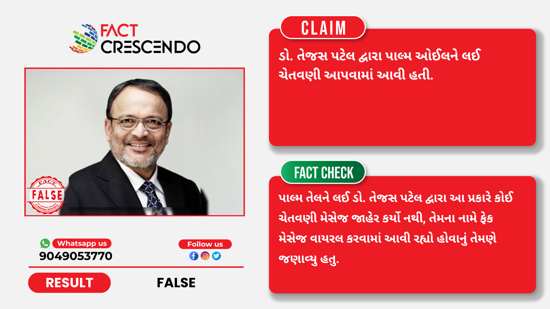 આમ, અમારી પડતાલમાં ઉપરોક્ત પોસ્ટ ખોટી સાબિત થાય છે. કારણ કે, પાલ્મ તેલને લઈ ડો. તેજસ પટેલ દ્વારા આ પ્રકારે કોઈ ચેતવણી મેસેજ જાહેર કર્યો નથી, તેમના નામે ફેક મેસેજ વાયરલ કરવામાં આવી રહ્યો હોવાનું તેમણે જણાવ્યુ હતુ.