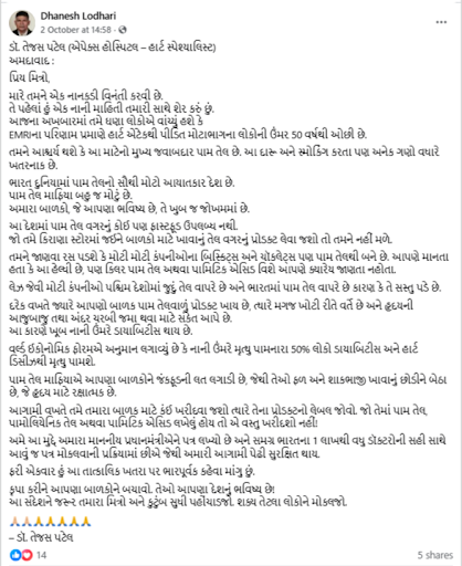 Title:શું ખરેખર પાલ્મ તેલને લઈ ડો. તેજસ પટેલ દ્વારા કોઈ મેસેજ જાહેર કરવામાં આવ્યો…? જાણો શું છે સત્ય….