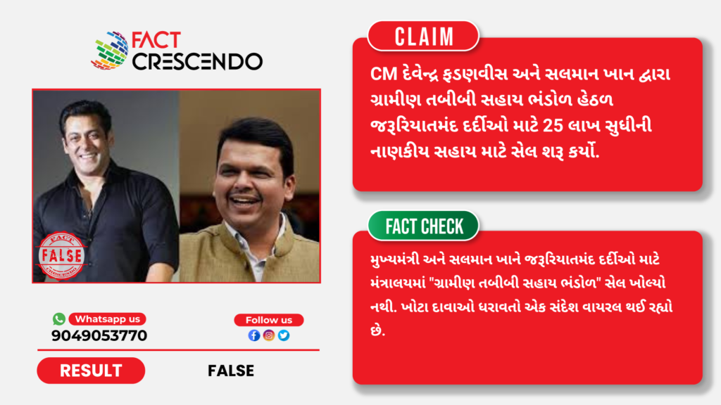 હાલમાં સોશિયલ મીડિયા પર એક દાવો વાયરલ થઈ રહ્યો છે જેમાં દાવો કરવામાં આવ્યો છે કે, મુખ્યમંત્રી દેવેન્દ્ર ફડણવીસ અને અભિનેતા સલમાન ખાને મંત્રાલય ખાતે “ગ્રામ વૈદ્યક્ય સહાયતા નિધિ” (ગ્રામીણ તબીબી સહાય ભંડોળ) નામનો એક સેલ શરૂ કર્યો છે. આ દાવા મુજબ, જરૂરિયાતમંદ દર્દીઓને ₹25 લાખ સુધીની નાણાકીય સહાય મેળવવા માટે પાત્ર હોવાનું કહેવાય છે.