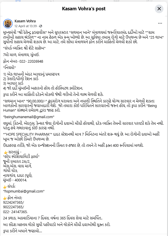 પોસ્ટમાં લખ્યું છે: “સોશિયલ મીડિયા પર ‘ગ્રામ વૈદિક સહાયતા નિધિ’ (ગ્રામ્ય તબીબી સહાય ભંડોળ) નામથી ફરતો સંદેશ સંપૂર્ણપણે ખોટો અને ભ્રામક છે. મંત્રાલયના નેજા હેઠળ આવી કોઈ યોજના અસ્તિત્વમાં નથી. વધુમાં, મુખ્યમંત્રી તબીબી સહાય ભંડોળ તબીબી સહાય માટે એકમાત્ર અધિકૃત માધ્યમ છે. નાગરિકોને સલાહ આપવામાં આવે છે કે આવી અફવાઓ પર વિશ્વાસ ન કરે.”