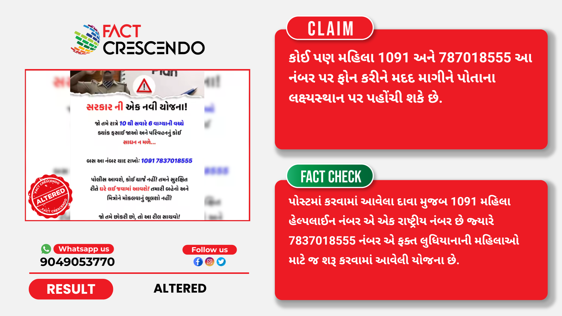 આમ, અમારી પડતાલમાં ઉપરોક્ત સાબિત થાય છે કારણ કે, પોસ્ટમાં કરવામાં આવેલા દાવા મુજબ 1091 મહિલા હેલ્પલાઈન નંબર એ એક રાષ્ટ્રીય નંબર છે જ્યારે 7837018555 નંબર એ ફક્ત લુધિયાનાની મહિલાઓ માટે જ શરૂ કરવામાં આવેલી યોજના છે.