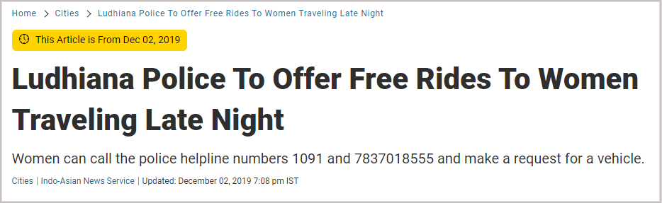 સૌપ્રથમ અમે ગૂગલ પર જૂદા-જૂદા કીવર્ડ સાથે સર્ચ કરતા અમને એનડીટીવી દ્વારા વર્ષ 2019માં પ્રકાશિત એક અહેવાલ પ્રાપ્ત થયો હતો. જેમાં માહિતી આપવામાં આવી હતી કે, “લુધિયાના પોલીસ દ્વારા મહિલાઓની સુરક્ષા માટે રાત્રિના 10 થી સવારે 6 વાગ્યા સુધી નિ:શુલ્ક સવારીની યોજના શરૂ કરવામાં આવી છે. જેના માટે 1091 અને 7837018555 હેલ્પલાઈન નંબર શરૂ કરવામાં આવ્યા છે. પરંતુ વધુમાં અમને એ માહિતી પ્રાપ્ત થઈ હતી કે, આ યોજના ફક્ત લુધિયાના પૂરતી જ મર્યાદિત છે. આ સંપૂર્ણ સમાચાર તમે નીચે જોઈ શકો છો.”