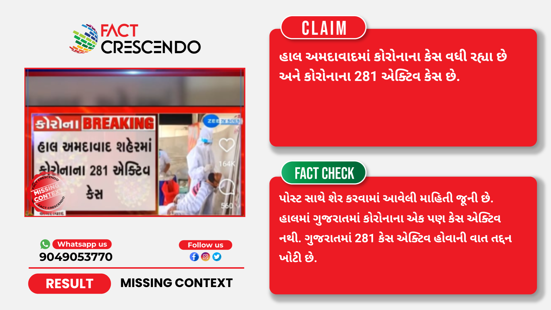 પોસ્ટ સાથે શેર કરવામાં આવેલી માહિતી જૂની છે. હાલમાં ગુજરાતમાં કોરોનાના એક પણ કેસ એક્ટિવ નથી. ગુજરાતમાં 281 કેસ એક્ટિવ હોવાની વાત તદ્દન ખોટી છે.