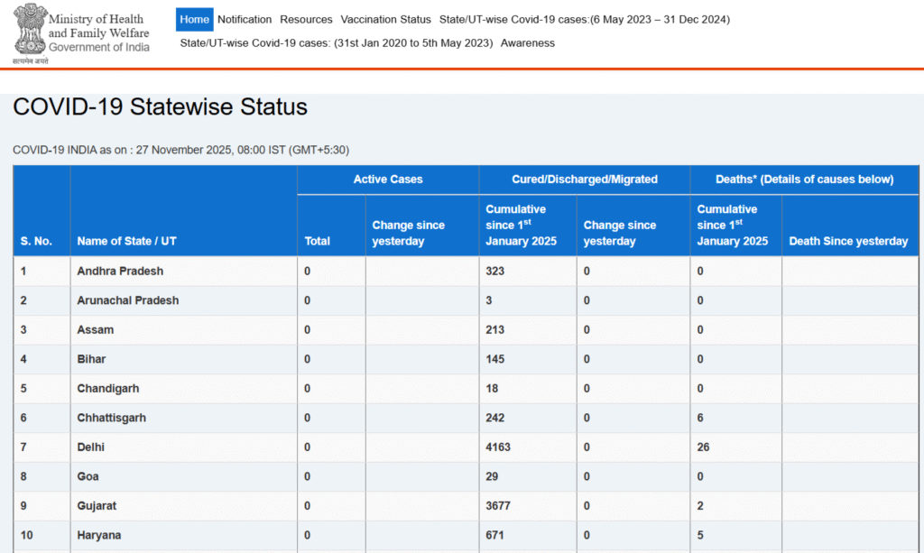 તેમજ હાલમાં ગુજરાતમાં કોરોનાના કેટલા કેસ છે તે જાણવા અમે હેલ્થ મિનિસ્ટ્રીની વેબસાઈટની મુલાકાત લીધી હતી. જેમાં આપવામાં આવેલી માહિતી મુજબ સમગ્ર દેશમાં માત્ર 4 જ કોરોનાના એક્ટિવ કેસ છે જેમાં ગુજરાતમાં એક પણ કેસ નથી.