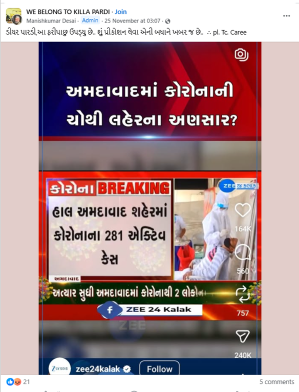 સોશિયલ મીડિયા યુઝર્સ દ્વારા તારીખ 25 નવેમ્બર 2025ના એક પોસ્ટ શેર કરવામાં આવી હતી. આ પોસ્ટમાં દાવો કરવામાં આવ્યો હતો કે, “હાલ અમદાવાદમાં કોરોનાના કેસ વધી રહ્યા છે અને કોરોનાના 281 એક્ટિવ કેસ છે.”