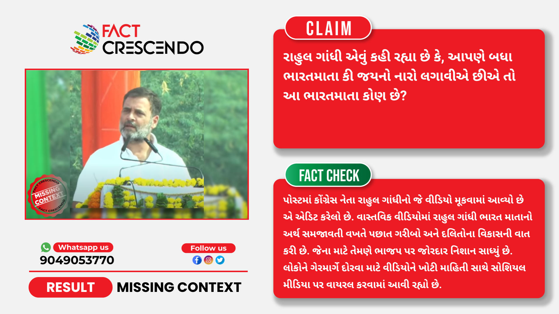 તાજેતરમાં સોશિયલ મીડિયા પર કોંગ્રેસ નેતા રાહુલ ગાંધીના નિવેદનનો એક વીડિયો વાયરલ થઈ રહ્યો છે જેની સાથે એવો દાવો કરવામાં આવી રહ્યો છે કે, રાહુલ ગાંધી એવું કહી રહ્યા છે કે, આપણે બધા ભારતમાતા કી જયનો નારો લગાવીએ છીએ તો આ ભારતમાતા કોણ છે?. પરંતુ ફેક્ટ ક્રેસેન્ડોની પડતાલમાં આ દાવો ખોટો અને પાયાવિહોણો સાબિત થાય છે કારણ કે, પોસ્ટમાં કોંગ્રેસ નેતા રાહુલ ગાંધીનો જે વીડિયો મૂકવામાં આવ્યો છે એ એડિટ કરેલો છે. વાસ્તવિક વીડિયોમાં રાહુલ ગાંધી ભારત માતાનો અર્થ સમજાવતી વખતે પછાત ગરીબો અને દલિતોના વિકાસની વાત કરી છે. જેના માટે તેમણે ભાજપ પર જોરદાર નિશાન સાધ્યું છે. લોકોને ગેરમાર્ગે દોરવા માટે વીડિયોને ખોટી માહિતી સાથે સોશિયલ મીડિયા પર વાયરલ કરવામાં આવી રહ્યો છે.
