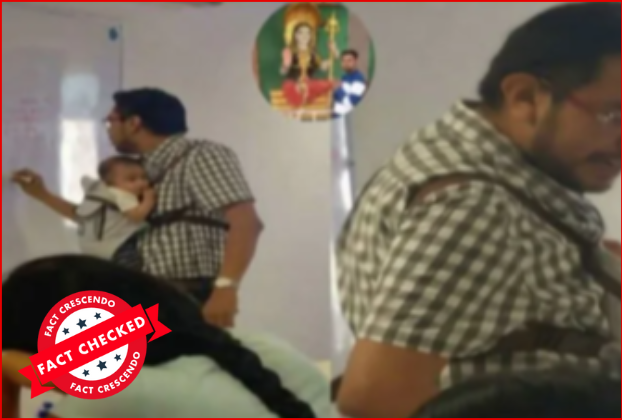 હાલમાં એક ફોટો વાયરલ થઈ રહ્યો છે જેમાં એક પુરૂષ એક નાના બાળકને પોતાની પાસે રાખી અને સામે બેસેલા વિદ્યાર્થીઓને ભણાવી રહ્યા છે. આ ફોટોને શેર કરીને દાવો કરવામાં આવી રહ્યો છે કે, “બાળકને પોતાની પાસે રાખી વિદ્યાર્થીને ભણાવી રહેલા શિક્ષક આ બાળકના પિતા છે.”