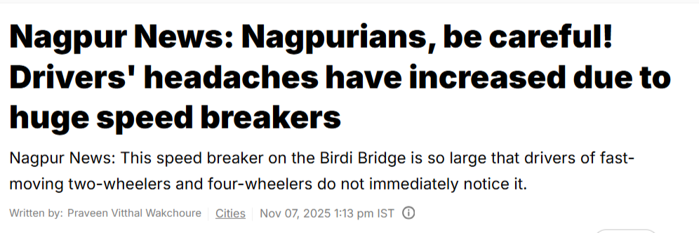 તેમજ વધુ સર્ચ કરતા અમને એનડીટીવી મરાઠીનો એક અહેવાલ પ્રાપ્ત થયો હતો. જેની સાથે માહિતી આપવામાં આવી હતી કે, “નાગપુરમાં ટ્રાફિકને સુગમ બનાવવા અને મુસાફરોની સલામતી સુનિશ્ચિત કરવા માટે બનાવવામાં આવેલ બિરડી ફ્લાયઓવર પરનો સ્પીડ બ્રેકર મુસાફરો માટે માથાનો દુખાવો બની રહ્યો છે. પુલ પર સ્થાપિત સ્પીડ બ્રેકર ખૂબ મોટો અને અયોગ્ય રીતે બનાવવામાં આવ્યો છે, જેના કારણે તે સલામતીને બદલે અકસ્માતોનું કારણ બને છે.”