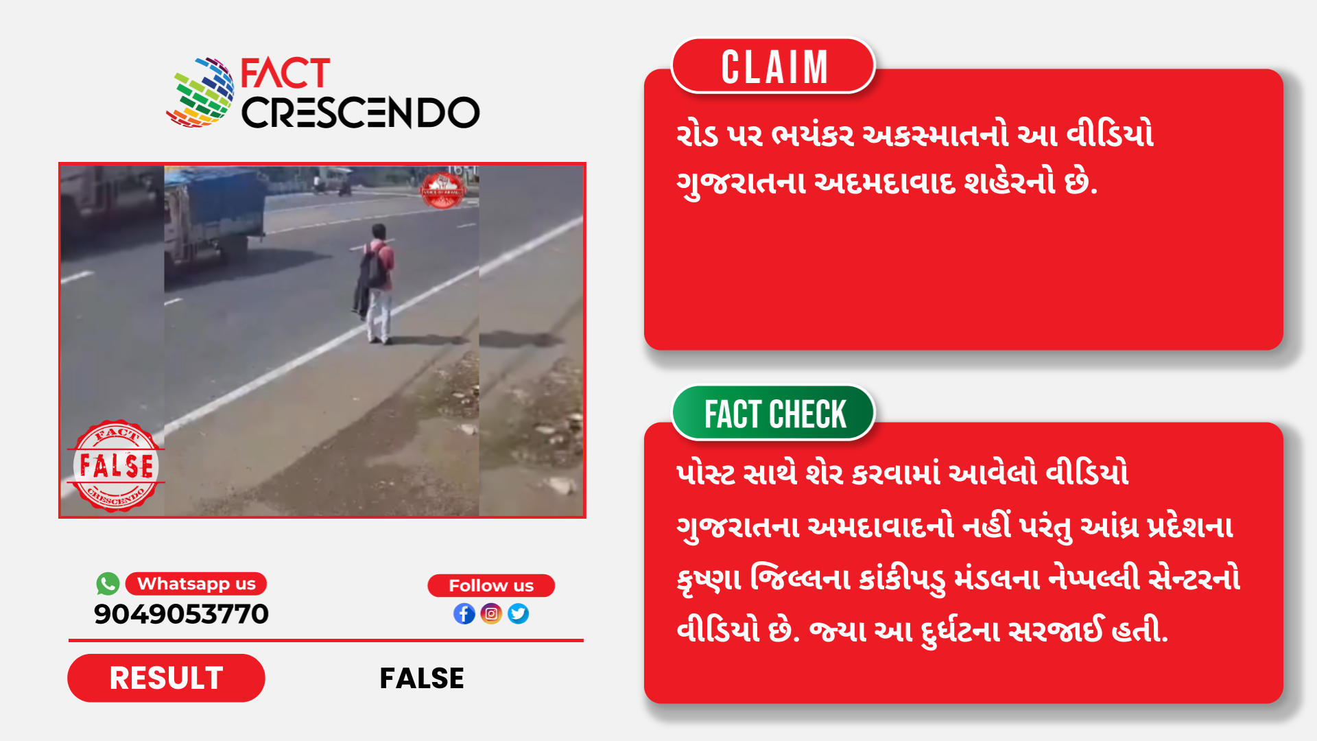 પોસ્ટ સાથે શેર કરવામાં આવેલો વીડિયો ગુજરાતના અમદાવાદનો નહીં પરંતુ આંધ્ર પ્રદેશના કૃષ્ણા જિલ્લના કાંકીપડુ મંડલના નેપ્પલ્લી સેન્ટરનો વીડિયો છે. જ્યા આ દુર્ધટના સરજાઈ હતી.