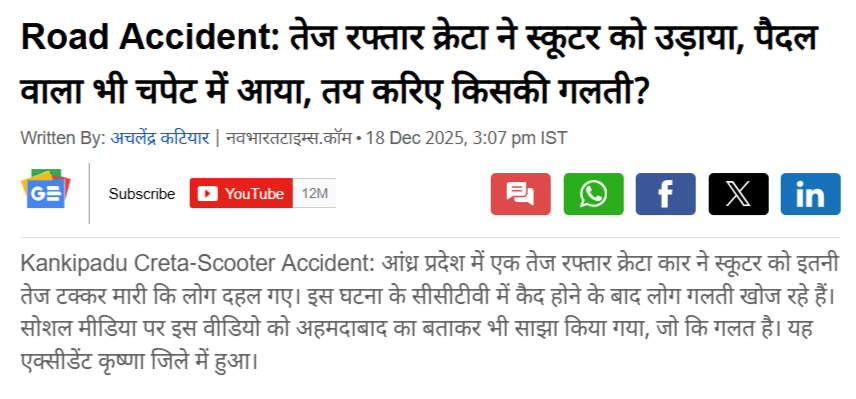 તેમજ વધુ સર્ચ કરતા અમને નવભારત ટાઈમ્સનો એક અહેવાલ પ્રાપ્ત થયો હતો. જેની સાથે માહિતી આપવામાં આવી હતી કે, “આંધ્રપ્રદેશમાં, એક ઝડપી ગતિએ આવતી ક્રેટા કારે એક સ્કૂટરને એટલી જોરથી ટક્કર મારી કે લોકો ચોંકી ગયા. સીસીટીવીમાં કેદ થયેલી આ ઘટનાની વ્યાપક ટીકા થઈ રહી છે. આ વીડિયોને સોશિયલ મીડિયા પર પણ શેર કરવામાં આવ્યો હતો જેમાં દાવો કરવામાં આવ્યો હતો કે તે અમદાવાદનો છે, જે ખોટો છે. આ અકસ્માત કૃષ્ણા જિલ્લામાં થયો હતો.”