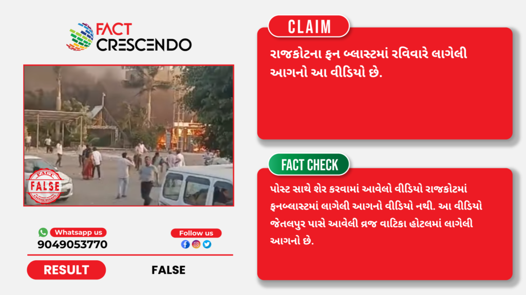 આમ, અમારી પડતાલમાં ઉપરોક્ત પોસ્ટ ખોટી સાબિત થાય છે. કારણ કે, પોસ્ટ સાથે શેર કરવામાં આવેલો વીડિયો રાજકોટમાં ફનબ્લાસ્ટમાં લાગેલી આગનો વીડિયો નથી. આ વીડિયો જેતલપુર પાસે આવેલી વ્રજ વાટિકા હોટલમાં લાગેલી આગનો છે.