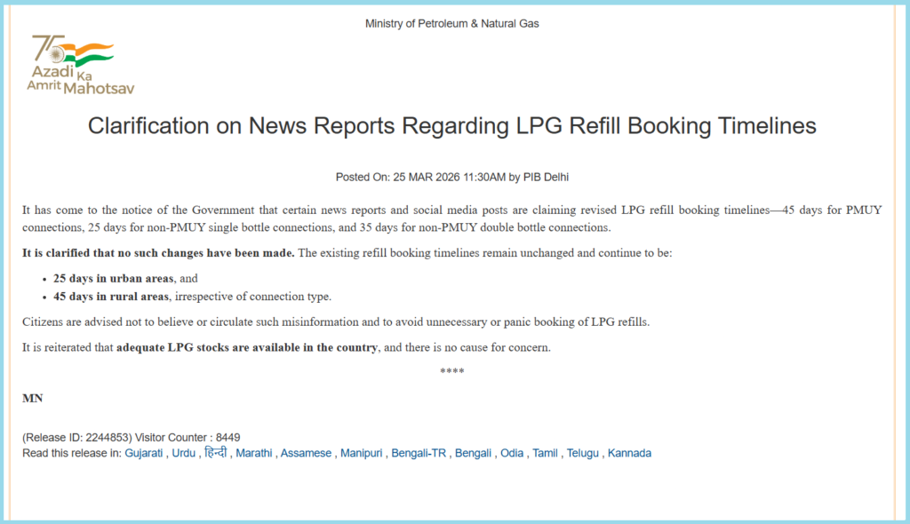 ઉપરોક્ત પોસ્ટમાં કરવામાં આવેલા દાવાની સત્યતા તપાસવી જરૂરી જણાતાં અમે અમારી પડતાલ/તપાસ કાર્યવાહી શરૂ કરી હતી. સૌપ્રથમ અમે પોસ્ટમાં મૂકવામાં આવેલા માહિતીને ગૂગલનો સહારો લઈ જુદા-જુદા કીવર્ડથી સર્ચ કરતાં અમને 25 માર્ચ, 2026ના રોજ PIBની વેબસાઇટ પર એક પ્રેસ રિલીઝ મળી. જેમાં વાયરલ દાવાને રદિયો આપતાં પેટ્રોલિયમ અને કુદરતી ગેસ મંત્રાલયે જણાવ્યું હતું કે, આવા કોઈ ફેરફાર કરવામાં આવ્યા નથી. હાલની રિફિલ બુકિંગ સમયરેખા યથાવત છે અને ચાલુ રહેશે. કનેક્શનના પ્રકારને ધ્યાનમાં લીધા વિના શહેરી વિસ્તારોમાં 25 દિવસ અને ગ્રામીણ વિસ્તારોમાં 45 દિવસની સમય મર્યાદા યથાવત છે.