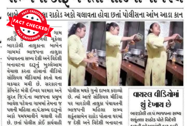 તાજેતરમાં સોશિયલ મીડિયા પર સમાચારપત્રના એક કટિંગમાં ભાજપના મહિલા તાલુકા પંચાયતના સભ્યનો દારુ વેચતો વીડિયો વાયરલ થયો હોવાના સમાચાર પ્રસારિત કરવામાં આવ્યા છે. જેમાં પોસ્ટમાં મૂકવામાં આવેલા ફોટો સાથેના લખાણમાં એવો દાવો કરવામાં આવી રહ્યો છે કે, તાજેતરમાં ભાજપના મહિલા તાલુકા પંચાયતના સભ્યનો દારુ વેચતો વીડિયો વાયરલ થયો છે. પરંતુ ફેક્ટ ક્રેસેન્ડોની પડતાલમાં આ દાવો અધૂરી માહિતી સાથેનો હોવાનું સાબિત થાય છે કારણ કે, પોસ્ટ સાથે શેર કરવામાં આવેલા સમાચાર તાજેતરના નહીં પરંતુ વર્ષ 2021માં બનેલી ઘટનાના છે. સોશિયલ મીડિયા પર અધૂરી માહિતી મૂકીને લોકોને ગેરમાર્ગે દોરવામાં આવી રહ્યા છે.