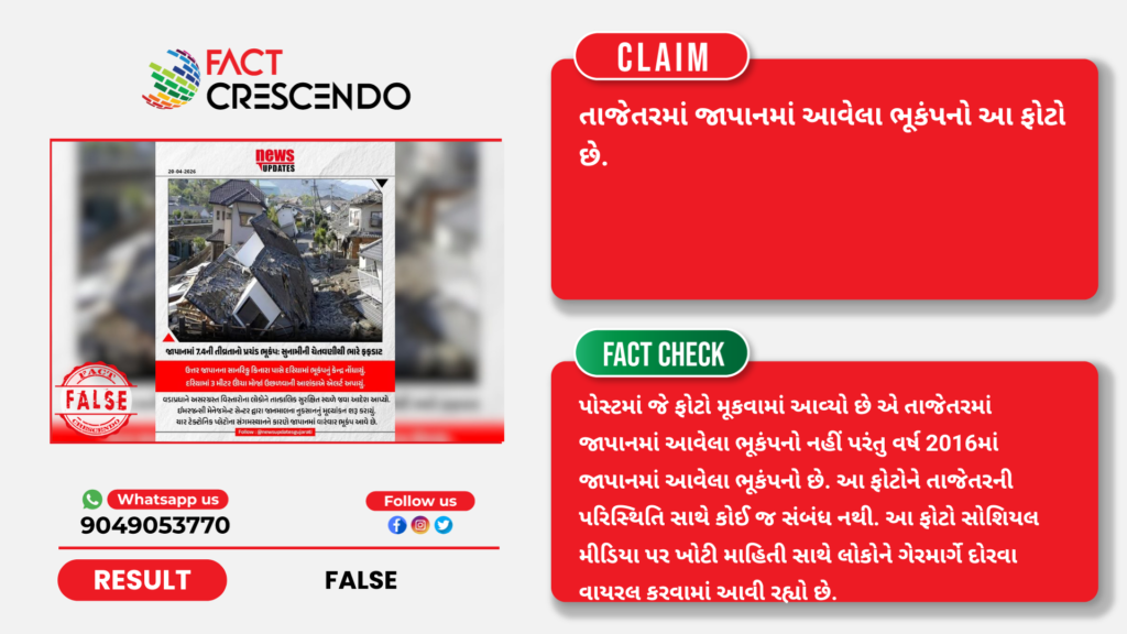 તાજેતરમાં સોશિયલ મીડિયા પર ભૂકંપના સીસીટીવીનો એક વીડિયો વાયરલ થઈ રહ્યો છે જેની સાથે એવો દાવો કરવામાં આવી રહ્યો છે કે, તાજેતરમાં જાપાનમાં આવેલા ભૂકંપનો આ ફોટો છે પરંતુ ફેક્ટ ક્રેસેન્ડોની પડતાલમાં આ દાવો ભ્રામક હોવાનું સાબિત થાય છે કારણ કે, પોસ્ટમાં જે ફોટો મૂકવામાં આવ્યો છે એ તાજેતરમાં જાપાનમાં આવેલા ભૂકંપનો નહીં પરંતુ વર્ષ 2016માં જાપાનમાં આવેલા ભૂકંપનો છે. આ ફોટોને તાજેતરની પરિસ્થિતિ સાથે કોઈ જ સંબંધ નથી. આ ફોટો સોશિયલ મીડિયા પર ખોટી માહિતી સાથે લોકોને ગેરમાર્ગે દોરવા વાયરલ કરવામાં આવી રહ્યો છે