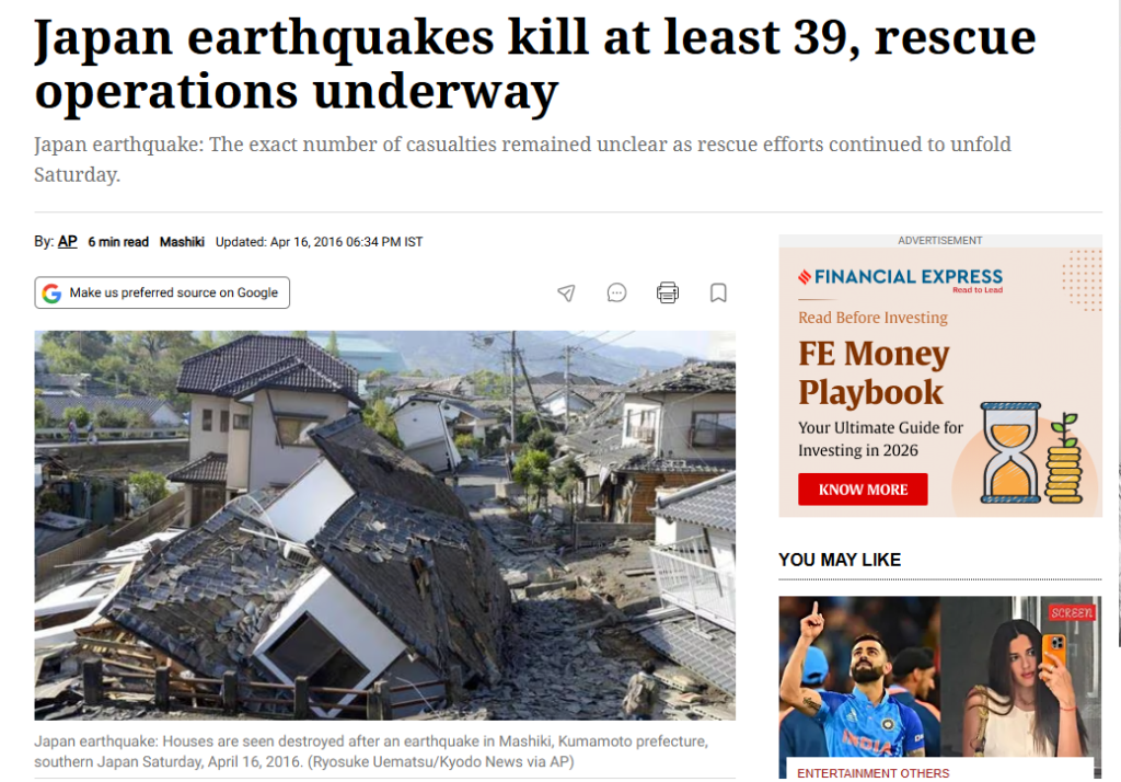 ઉપરોક્ત પોસ્ટમાં કરવામાં આવેલા દાવાની સત્યતા તપાસવી જરૂરી જણાતાં અમે અમારી પડતાલ/તપાસ કાર્યવાહી શરૂ કરી હતી. સૌપ્રથમ અમે પોસ્ટમાં મૂકવામાં આવેલા ફોટોને ગૂગલ રિવર્સ ઈમેજથી સર્ચ કર્યું. જેનાથી અમને આ જ વાયરલ ફોટો સાથેના સમાચાર indianexpress.com દ્વારા 16 એપ્રિલ, 2016ના રોજ પ્રસારિત કરવામાં આવ્યા હોવાની માહિતી પ્રાપ્ત થઈ હતી. જેમાં એવી માહિતી આપવામાં આવી હતી કે, આ ફોટો જાપાનમાં આવેલા ભૂકંપનો છે જેમાં લગભગ 39 લોકોના મોત થયા હતા જેના પરથી એ સ્પષ્ટ સાબિત થાય છે કે, વાયરલ ફોટો તાજેતરનો નહીં પરંતુ વર્ષ 2016નો છે.