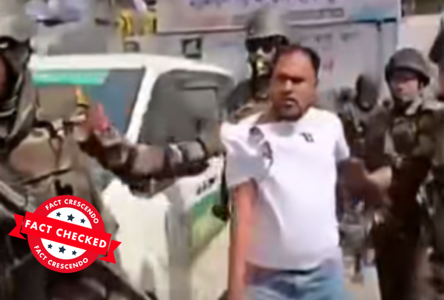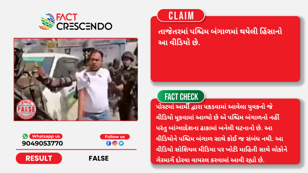 તાજેતરમાં સોશિયલ મીડિયા પર એક વીડિયો વાયરલ થઈ રહ્યો છે જેની સાથે એવો દાવો કરવામાં આવી રહ્યો છે કે, તાજેતરમાં પશ્ચિમ બંગાળમાં થયેલી હિંસાનો આ વીડિયો છે પરંતુ ફેક્ટ ક્રેસેન્ડોની પડતાલમાં આ દાવો ભ્રામક હોવાનું સાબિત થાય છે કારણ કે, પોસ્ટમાં આર્મી દ્વારા પકડવામાં આવેલા યુવકનો જે વીડિયો મૂકવામાં આવ્યો છે એ પશ્ચિમ બંગાળનો નહીં પરંતુ બાંગ્લાદેશના ઢાકામાં બનેલી ઘટનાનો છે. આ વીડિયોને પશ્ચિમ બંગાળ સાથે કોઈ જ સંબંધ નથી. આ વીડિયો સોશિયલ મીડિયા પર ખોટી માહિતી સાથે લોકોને ગેરમાર્ગે દોરવા વાયરલ કરવામાં આવી રહ્યો છે