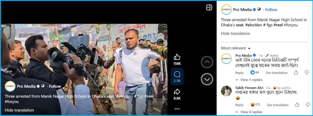 ત્યાર બાદ અમે પોસ્ટમાં મૂકવામાં આવેલા વીડિયોમાંથી સ્ક્રીનશોટ લીધો અને રિવર્સ ઈમેજ સર્ચ કર્યું. જેનાથી અમને આ જ વાયરલ વીડિયો એક બાંગ્લાદેશી સમાચાર ચેનલના ફેસબુક પેજ પર 12 ફેબ્રુઆરી, 2026ના રોજ પ્રસારિત કરવામાં આવ્યો હોવાની માહિતી પ્રાપ્ત થઈ હતી. જેની સાથે એવી માહિતી આપવામાં આ હતી કે, આ ઘટના ઢાકાના માનિકનગર મોડેલ હાઇસ્કૂલ મતદાન મથક નજીકની છે.