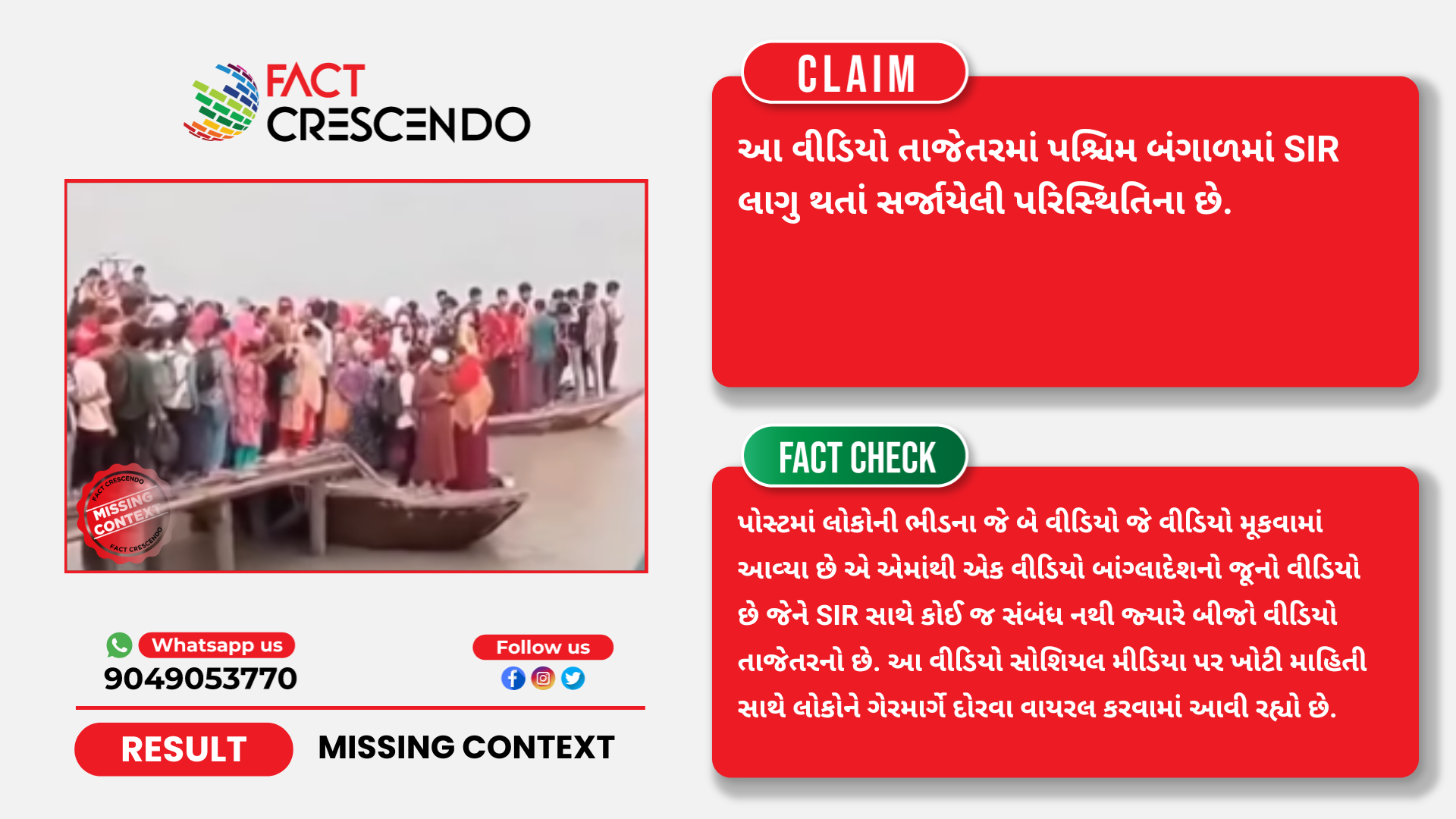 તાજેતરમાં સોશિયલ મીડિયા પર લોકોની ભીડના બે વીડિયો વાયરલ થઈ રહ્યા છે. આ વીડિયો સાથેના લખાણમાં એવો દાવો કરવામાં આવી રહ્યો છે કે, આ વીડિયો તાજેતરમાં પશ્ચિમ બંગાળમાં SIR લાગુ થતાં સર્જાયેલી પરિસ્થિતિના છે. પરંતુ ફેક્ટ ક્રેસેન્ડોની પડતાલમાં આ દાવો અધૂરી માહિતી સાથેનો હોવાનું સાબિત થાય છે કારણ કે, પોસ્ટમાં લોકોની ભીડના જે બે વીડિયો જે વીડિયો મૂકવામાં આવ્યા છે એ એમાંથી એક વીડિયો બાંગ્લાદેશનો જૂનો વીડિયો છે જેને SIR સાથે કોઈ જ સંબંધ નથી જ્યારે બીજો વીડિયો તાજેતરનો છે. આ વીડિયો સોશિયલ મીડિયા પર ખોટી માહિતી સાથે લોકોને ગેરમાર્ગે દોરવા વાયરલ કરવામાં આવી રહ્યો છે.