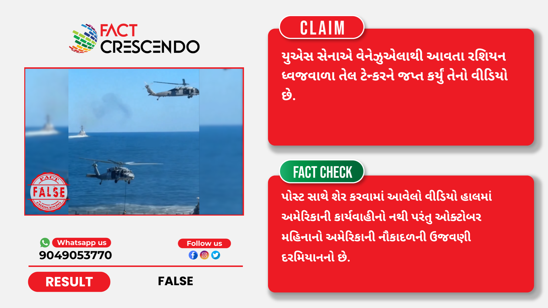 સોશિયલ મીડિયા યુઝર્સ દ્વારા તારીખ 08 જાન્યુઆરી 2026ના એક પોસ્ટ શેર કરવામાં આવી હતી. આ પોસ્ટમાં દાવો કરવામાં આવ્યો હતો કે, “યુએસ સેનાએ વેનેઝુએલાથી આવતા રશિયન ધ્વજવાળા તેલ ટેન્કરને જપ્ત કર્યું તેનો વીડિયો છે.”