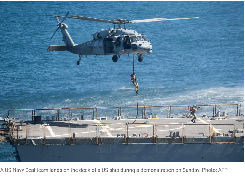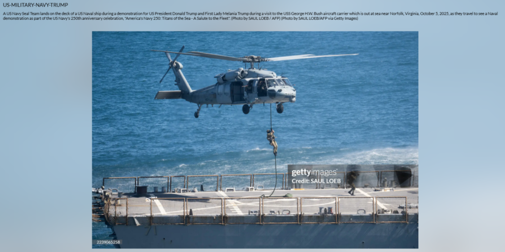 ઉપરોક્ત પરિણામો પરથી અમને 6 ઓક્ટોબર, 2025ના રોજ સાઉથ ચાઇના મોર્નિંગ પોસ્ટ વેબસાઇટ પરનો એક અહેવાલ પ્રાપ્ત થયો હતો. જેની સાથે માહિતી આપવામાં આવી હતી કે, “એક પ્રદર્શન દરમિયાન યુએસ નેવી ટીમ અમેરિકન જહાજના ડેક પર ઉતરી રહી છે.” રિપોર્ટ અનુસાર, યુએસ રાષ્ટ્રપતિ ડોનાલ્ડ ટ્રમ્પે નેવીની 250મી વર્ષગાંઠ પર વર્જિનિયાના નોર્ફોકમાં યુએસ નેવીની પ્રશંસા કરી.