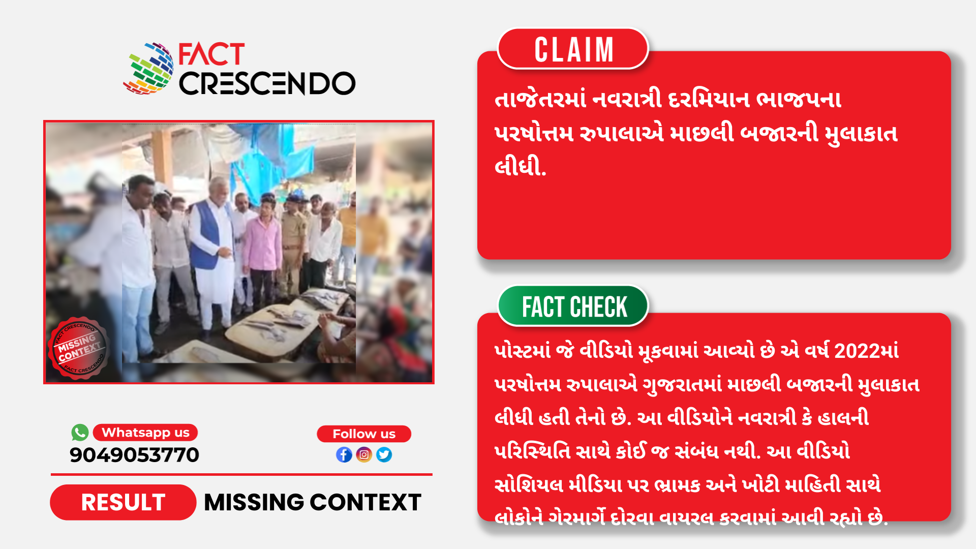 તાજેતરમાં સોશિયલ મીડિયા પર બાજપના નેતા પરષોત્તમ રુપાલાનો એક વીડિયો વાયરલ થઈ રહ્યો છે. આ વીડિયો સાથેના લખાણમાં એવો દાવો કરવામાં આવી રહ્યો છે કે, તાજેતરમાં નવરાત્રી દરમિયાન ભાજપના પરષોત્તમ રુપાલાએ માછલી બજારની મુલાકાત લીધી. પરંતુ ફેક્ટ ક્રેસેન્ડોની પડતાલમાં આ દાવો ખોટો અને પાયાવિહોણો હોવાનું સાબિત થાય છે કારણ કે, પોસ્ટમાં જે વીડિયો મૂકવામાં આવ્યો છે એ વર્ષ 2022માં પરષોત્તમ રુપાલાએ ગુજરાતમાં માછલી બજારની મુલાકાત લીધી હતી તેનો છે. આ વીડિયોને નવરાત્રી કે હાલની પરિસ્થિતિ સાથે કોઈ જ સંબંધ નથી. આ વીડિયો સોશિયલ મીડિયા પર ભ્રામક અને ખોટી માહિતી સાથે લોકોને ગેરમાર્ગે દોરવા વાયરલ કરવામાં આવી રહ્યો છે.