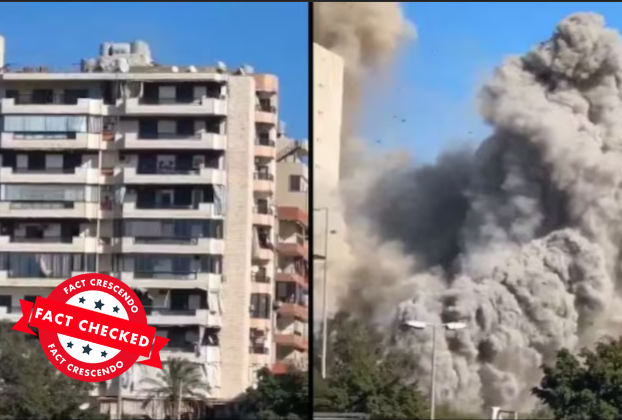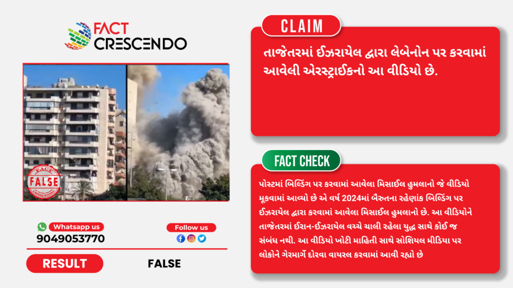 તાજેતરમાં સોશિયલ મીડિયા પર હેલિકોપ્ટરનો એક વીડિયો વાયરલ થઈ રહ્યો છે જેની સાથે એવો દાવો કરવામાં આવી રહ્યો છે કે, તાજેતરમાં ઈઝરાયેલ દ્વારા લેબેનોન પર કરવામાં આવેલી એરસ્ટ્રાઈકનો આ વીડિયો છે પરંતુ ફેક્ટ ક્રેસેન્ડોની પડતાલમાં આ દાવો ભ્રામક હોવાનું સાબિત થાય છે કારણ કે, પોસ્ટમાં બિલ્ડિંગ પર કરવામાં આવેલા મિસાઈલ હુમલાનો જે વીડિયો મૂકવામાં આવ્યો છે એ વર્ષ 2024માં બૈરુતના રહેણાંક બિલ્ડિંગ પર ઈઝરાયેલ દ્વારા કરવામાં આવેલા મિસાઈલ હુમલાનો છે. આ વીડિયોને તાજેતરમાં ઈરાન-ઈઝરાયેલ વચ્ચે ચાલી રહેલા યુદ્ધ સાથે કોઈ જ સંબંધ નથી. આ વીડિયો ખોટી માહિતી સાથે સોશિયલ મીડિયા પર લોકોને ગેરમાર્ગે દોરવા વાયરલ કરવામાં આવી રહ્યો છે.