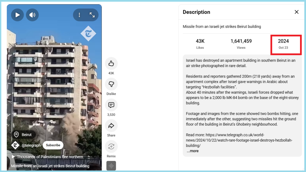 આ વીડિયોના વર્ણનમાં લખ્યું છે કે, “ઇઝરાયલે દક્ષિણ બૈરૂતમાં એક એપાર્ટમેન્ટ બિલ્ડિંગનો નાશ કર્યો છે, જેનો આ દુર્લભ ફોટોગ્રાફ છે.