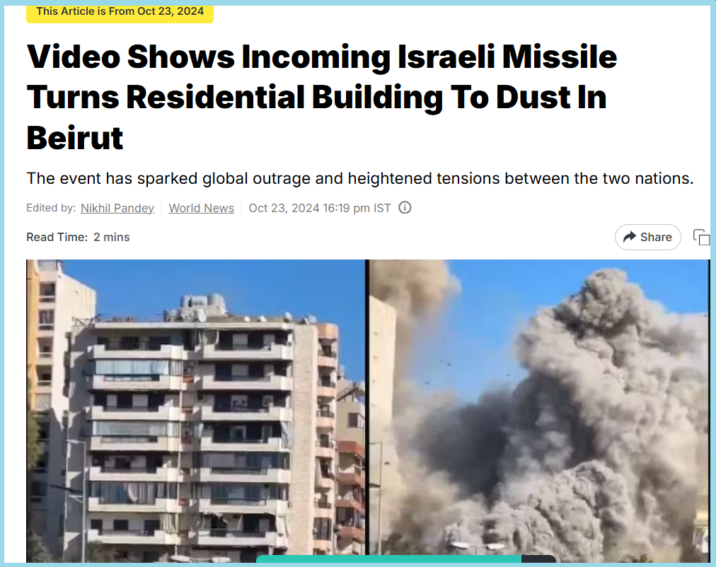 આ રિપોર્ટ અનુસાર, વીડિયોમાં બૈરૂતમાં એક રહેણાંક ઇમારત પર ઇઝરાયલ દ્વારા કરવામાં આવેલા મિસાઇલ હુમલાની માહિતી આપવામાં આવી છે.
