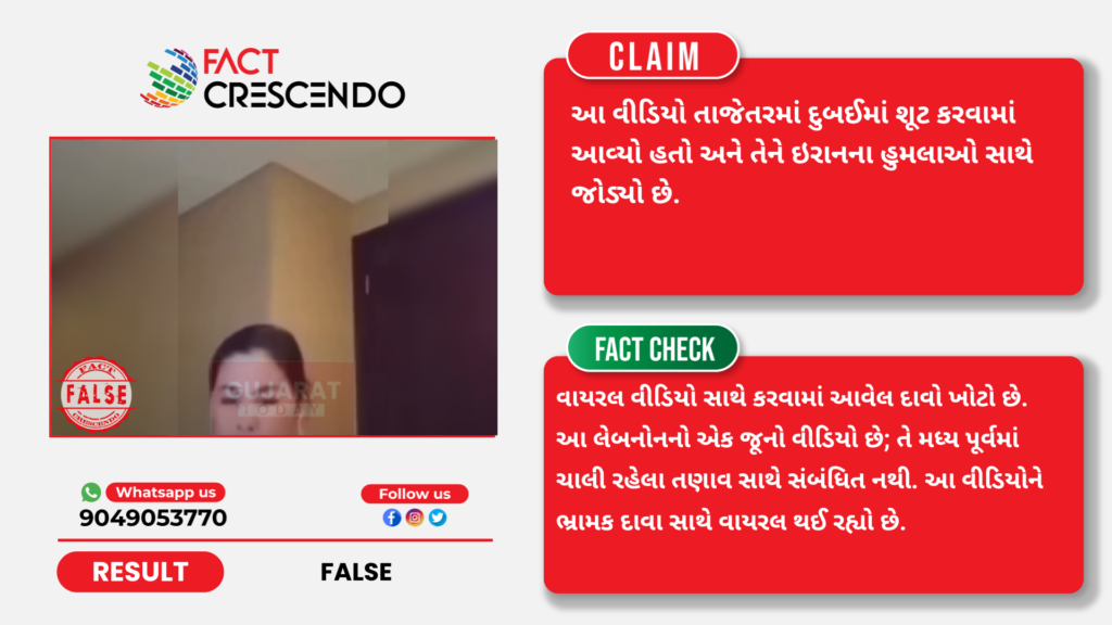 આમ, અમારી પડતાલમાં ઉપરોક્ત પોસ્ટ ખોટી સાબિત થાય છે. કારણ કે, વાયરલ વીડિયો સાથે કરવામાં આવેલ દાવો ખોટો છે. આ લેબનોનનો એક જૂનો વીડિયો છે; તે મધ્ય પૂર્વમાં ચાલી રહેલા તણાવ સાથે સંબંધિત નથી. આ વીડિયોને ભ્રામક દાવા સાથે વાયરલ થઈ રહ્યો છે.