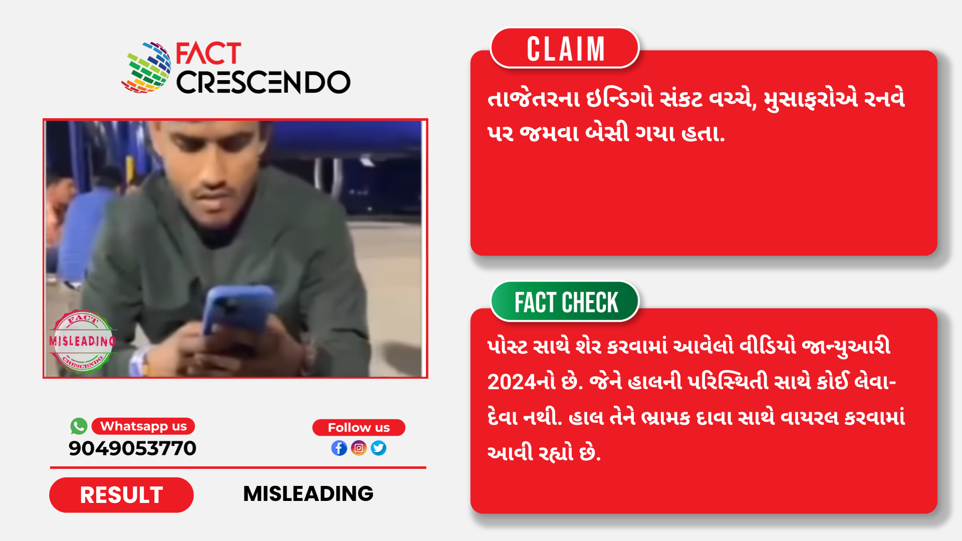 ઇન્ડિગોની અનેક ફ્લાઇટ રદ થવાના કારણે સર્જાયેલા સંકટ વચ્ચે, સોશિયલ મીડિયા પર એક વીડિયો વાયરલ થઈ રહ્યો છે. તેમાં કેટલાક મુસાફરો એરપોર્ટ પર ફ્લોર પર બેસીને ખોરાક ખાતા જોઈ શકાય છે. આ વીડિયોને શેર કરીને દાવો કરવામાં આવી રહ્યો છે કે, “તાજેતરના ઇન્ડિગો સંકટ વચ્ચે, મુસાફરોએ રનવે પર જમવા બેસી ગયા હતા.”