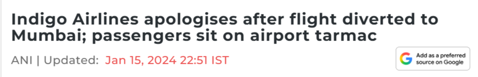 તેમજ વધુ સર્ચ કરતા અમને 15 જાન્યુઆરી ૨૦૨4ના રોજ ANI ની વેબસાઇટ પર પ્રકાશિત થયેલા અહેવાલ મુજબ, ગોવા-દિલ્હી ફ્લાઇટને મુંબઈ ડાયવર્ટ કરવામાં આવી હતી અને એરપોર્ટ રેમ્પ પર મુસાફરો ખાતા હોવાનો વીડિયો વાયરલ થયા પછી, એરલાઇને માફી માંગી હતી અને ભવિષ્યમાં આવી ઘટનાઓ અટકાવવા માટે પગલાં લેવાનું વચન આપ્યું હતું. દિલ્હીમાં ઓછી દૃશ્યતાને કારણે ફ્લાઇટને મુંબઈ ડાયવર્ટ કરવામાં આવી હતી.