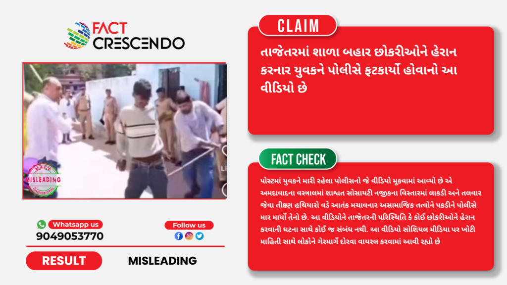 તાજેતરમાં સોશિયલ મીડિયા પર એક વીડિયો વાયરલ થઈ રહ્યો છે જેની સાથે એવો દાવો કરવામાં આવી રહ્યો છે કે, તાજેતરમાં શાળા બહાર છોકરીઓને હેરાન કરનાર યુવકને પોલીસે ફટકાર્યો પરંતુ ફેક્ટ ક્રેસેન્ડોની પડતાલમાં આ દાવો ભ્રામક હોવાનું સાબિત થાય છે કારણ કે, પોસ્ટમાં યુવકને મારી રહેલા પોલીસનો જે વીડિયો મૂકવામાં આવ્યો છે એ અમદાવાદના વસ્ત્રાલમાં શાશ્વત સોસાયટી નજીકના વિસ્તારમાં લાકડી અને તલવાર જેવા તીક્ષ્ણ હથિયારો વડે આતંક મચાવનાર અસામાજિક તત્વોને પકડીને પોલીસે માર માર્યો તેનો છે. આ વીડિયોને તાજેતરની પરિસ્થિતિ કે કોઈ છોકરીઓને હેરાન કરવાની ઘટના સાથે કોઈ જ સંબંધ નથી. આ વીડિયો સોશિયલ મીડિયા પર ખોટી માહિતી સાથે લોકોને ગેરમાર્ગે દોરવા વાયરલ કરવામાં આવી રહ્યો છે.
