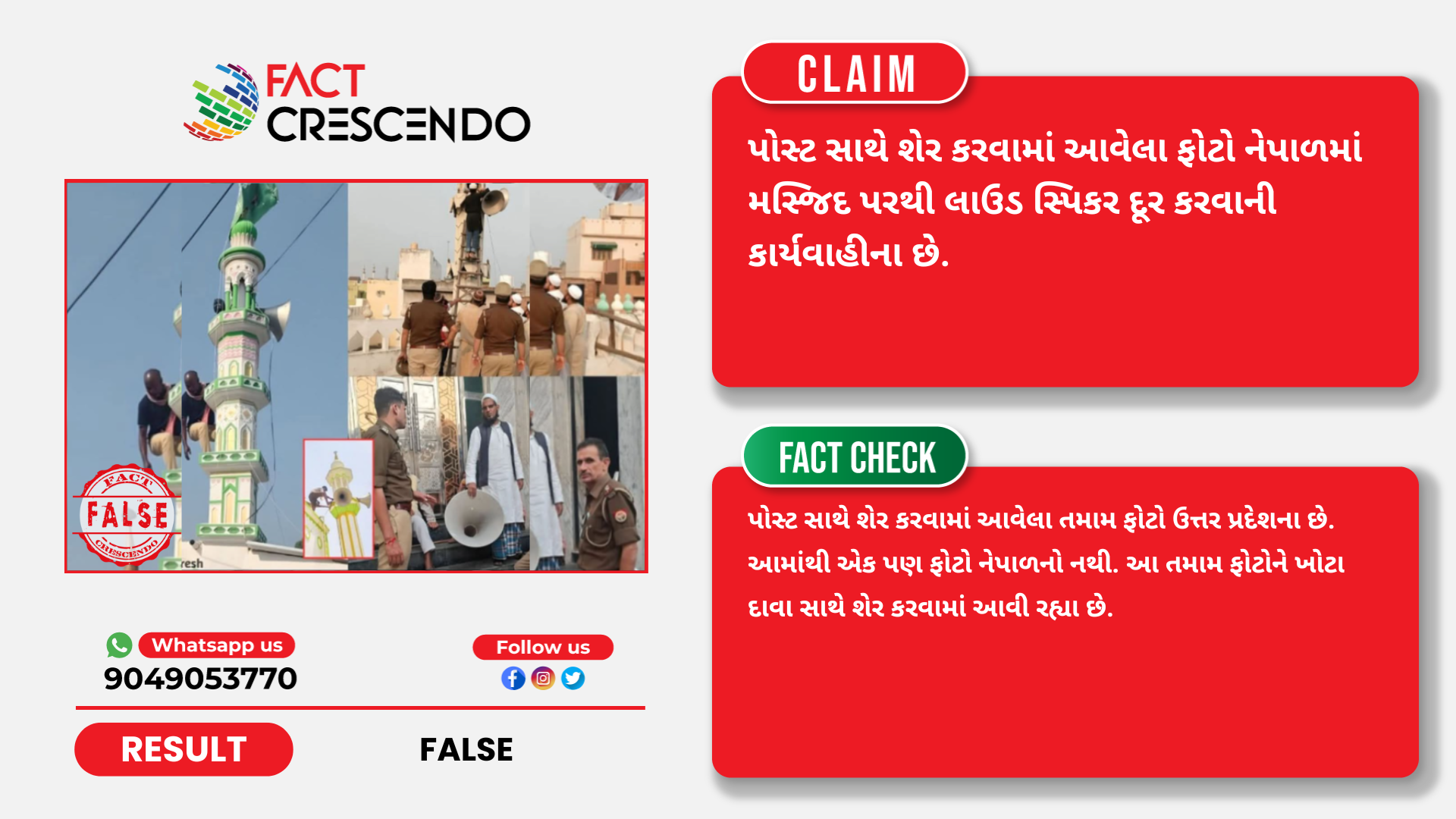 (જો તમારી પાસે પણ સોશિયલ મિડિયાના માધ્યમથી કોઈ શંકાસ્પદ મેસેજ, પોસ્ટ, ફોટો અને વિડિયો અથવા સમાચાર હોય, તો તેની સત્યતા જાણવા માટે તમે અમને અમારા વોટ્સઅપ ફેક્ટલાઈન નંબર (9049053770) પર મોકલો. અમારા લેટેસ્ટ ફેક્ટ ચેક વાંચવા માટે Facebook, Instagram અને Twitter પર Fact Crescendoને ફોલો કરો.)
