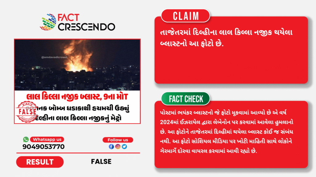 તાજેતરમાં સોશિયલ મીડિયા પર ભયંકર બ્લાસ્ટનો એક ફોટો વાયરલ થઈ રહ્યો છે જેની સાથે એવો દાવો કરવામાં આવી રહ્યો છે કે, તાજેતરમાં દિલ્હીના લાલ કિલ્લા નજીક થયેલા બ્લાસ્ટનો આ ફોટો છે. પરંતુ ફેક્ટ ક્રેસેન્ડોની પડતાલમાં આ દાવો ખોટો હોવાનું સાબિત થાય છે કારણ કે, પોસ્ટમાં ભયંકર બ્લાસ્ટનો જે ફોટો મૂકવામાં આવ્યો છે એ વર્ષ 2024માં ઈઝરાયેલ દ્વારા લેબેનોન પર કરવામાં આવેલા હુમલાનો છે. આ ફોટોને તાજેતરમાં દિલ્હીમાં થયેલા બ્લાસ્ટ કોઈ જ સંબંધ નથી. આ ફોટો સોશિયલ મીડિયા પર ખોટી માહિતી સાથે લોકોને ગેરમાર્ગે દોરવા વાયરલ કરવામાં આવી રહ્યો છે.