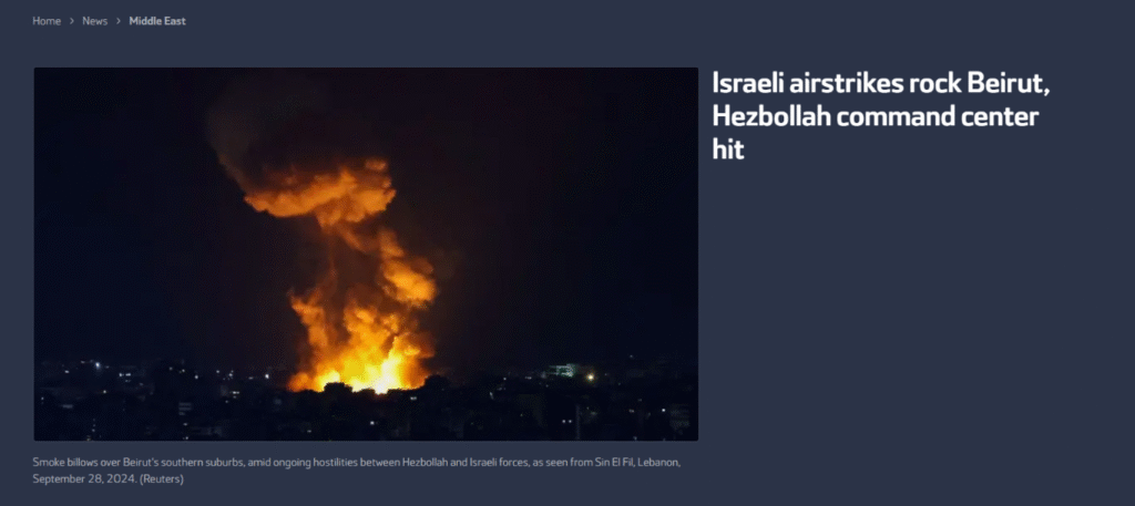 ઉપરોક્ત પોસ્ટમાં કરવામાં આવેલા દાવાની સત્યતા તપાસવી જરૂરી જણાતાં અમે અમારી પડતાલ/તપાસ કાર્યવાહી શરૂ કરી હતી. તપાસની શરુઆતમાં અમે પોસ્ટમાં મૂકવામાં આવેલા ફોટોને ગુગલ રિવર્સ ઈમેજનો સહારો લઈને સર્ચ કરતાં અમને પોસ્ટમાં મૂકવામાં આવેલા આ જ ફોટો સાથેના સમાચાર english.alarabiya.net દ્વારા 28 સપ્ટેમ્બર, 2024ના રોજ પ્રસારિત કરવામાં આવ્યા હોવાની માહિતી પ્રાપ્ત થઈ હતી. જેમાં એવી માહિતી આપવામાં આવી હતી કે, ઈઝરાયેલ દ્વારા લેબેનોન પર કરવામાં આવેલા હુમલાનો આ ફોટો છે.